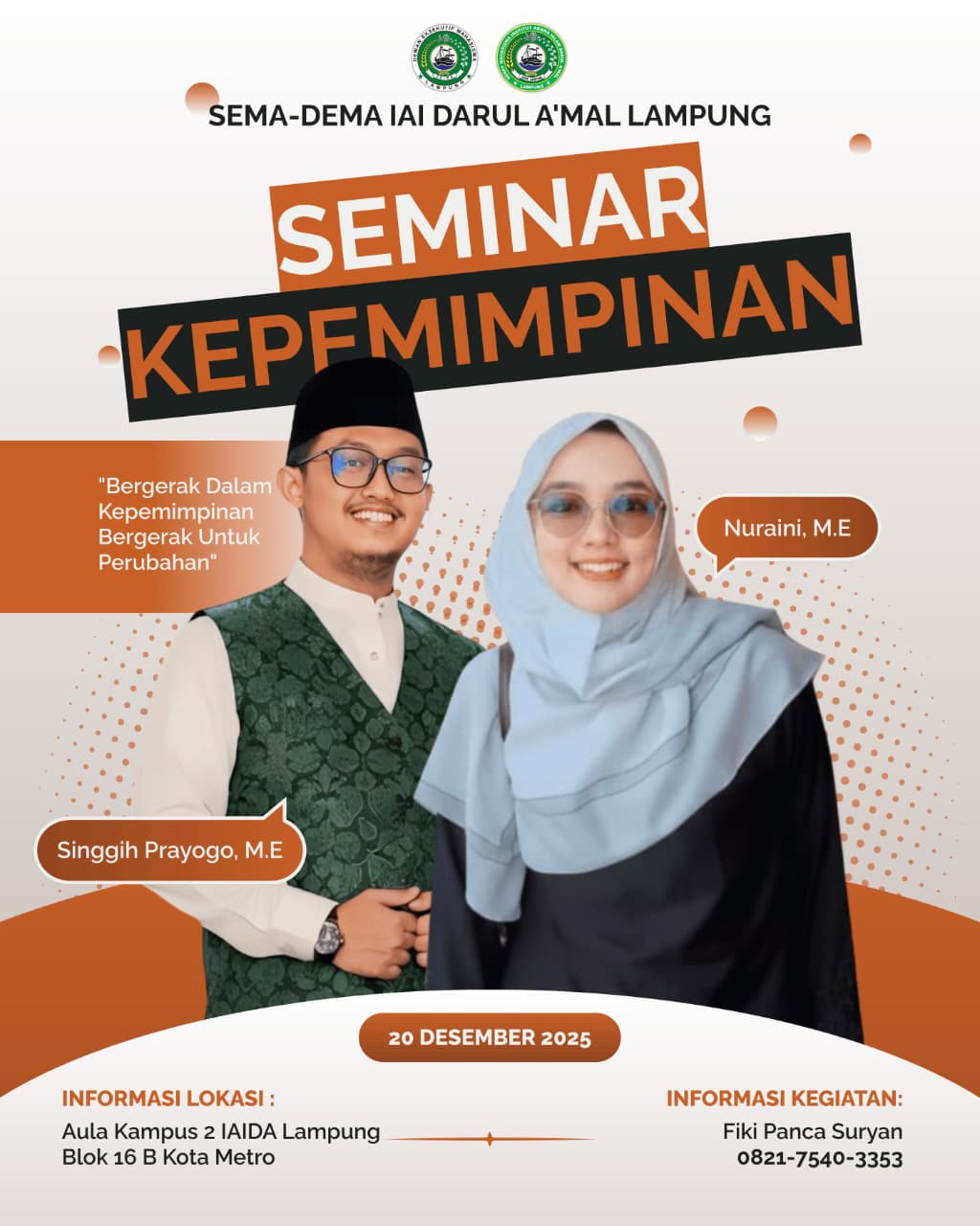 Seminar bertema “Bersatu dalam Kepemimpinan, Bergerak untuk Perubahan” bagi mahasiswa diselenggarakan pada Sabtu, 20 Desember 2025, bertempat di Aula Kampus 2 Institut Agama Islam Darul A’mal (IAIDA) . . . 0